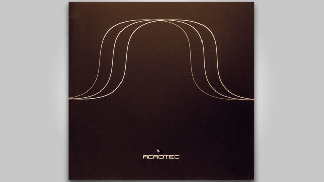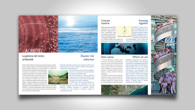“Ricerca applicata” e “trasferimento tecnologico al settore industriale” sono le parole chiave della mission di Acrotec, azienda govane e dinamica, con un alto tasso di crescita e di innovazione. Un alto posizionamento che doveva essere espresso attraverso una linea rappresentativa, graficamente e simbolicamente, del livello di eccellenza, sia sul piano scientifico che su quello tecnologico dei servizi e dei sistemi informatici Acrotec. Una linea che è stata messa a punto a partire dal restyling del logo, fino a una brochure aziendale particolarmente originale nello sviluppo cartotecnico, di stile rigorosamente High Tech.